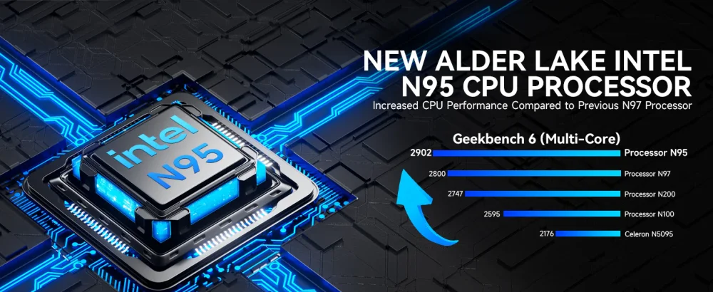 ⚡ Intel Alder Lake‑N95 Prozessor — energiesparende Leistung für Browser, Office‑Apps und Medienwiedergabe.